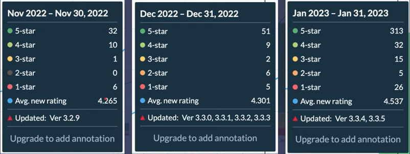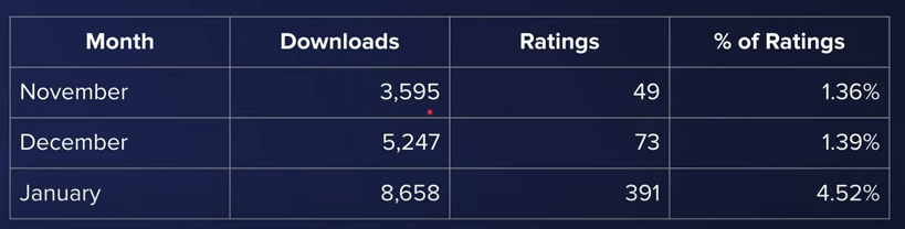 As you can see, although we did get more downloads in January compared to previous months, the percentage of ratings we received increased by 3X!